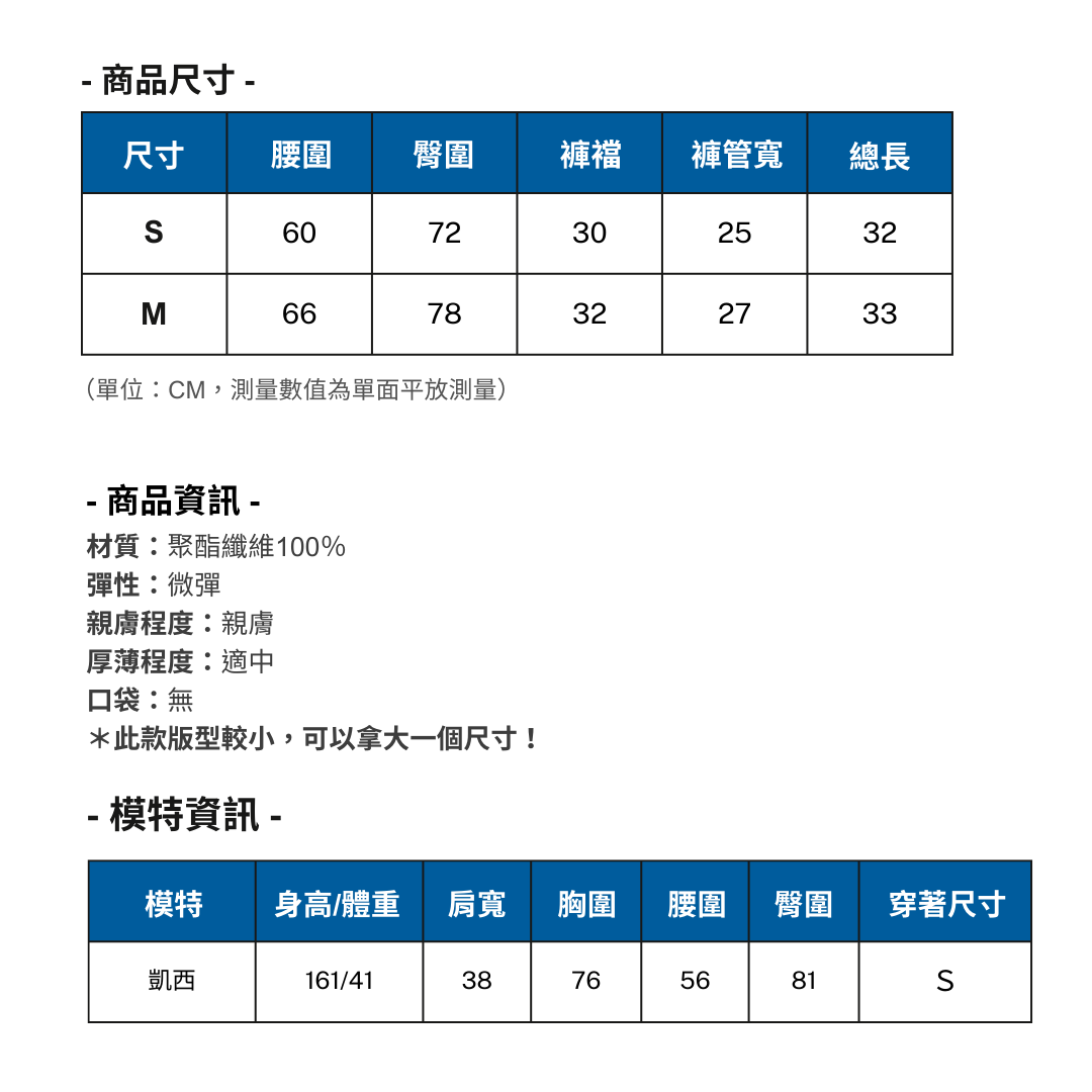 - 每個人身型比例不同,穿著感受一定會有所差異,以上數值僅供參考,若不確定適合哪個尺寸,可以拿自己平穿的衣服、褲子測量平量數據喔!